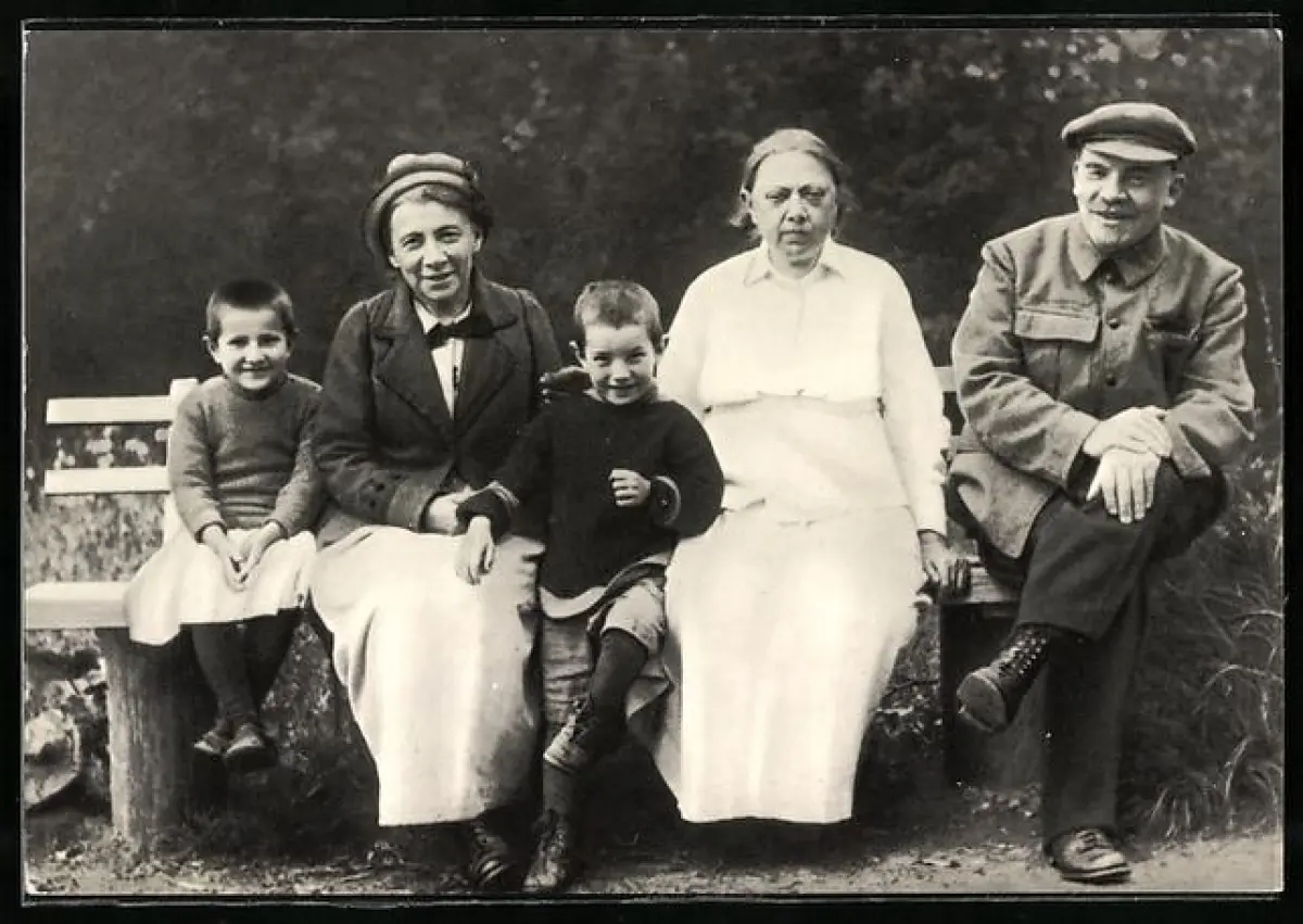 AK Lenin mit zwei Frauen und zwei Kindern auf einer Bank