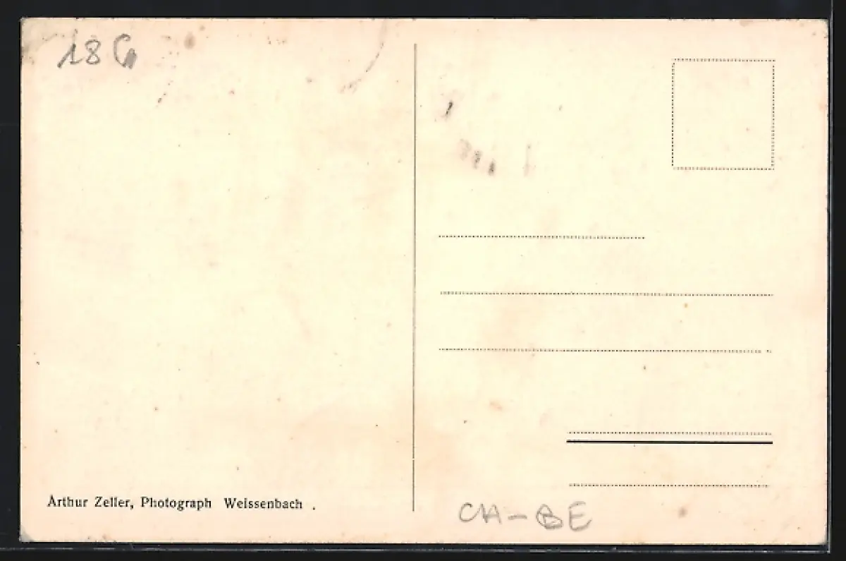 Personenbezogene Daten auf der Rückseite der Karte wurden durch blauen Textmarker unkenntlich gemacht. Die blauen Stellen sind auf die Vorderseite durchgeweicht und wirken sich negativ auf das Postkartenfoto aus