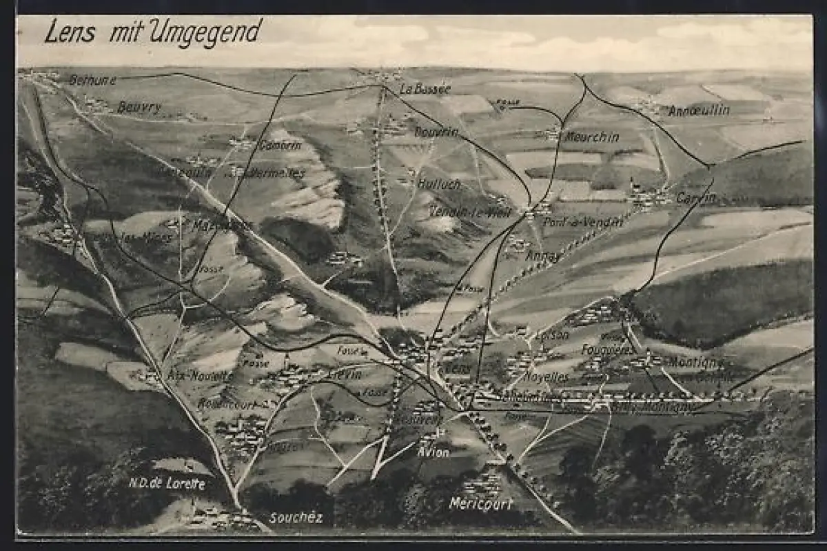 AK Lens, Vue aérienne des environs avec villages et chemins de fer