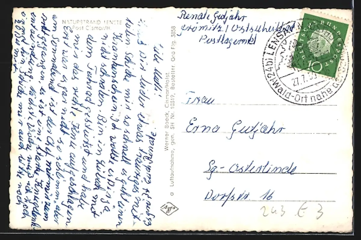 Personenbezogene Daten auf der Rückseite der Karte wurden durch blauen Textmarker unkenntlich gemacht. Die blauen Stellen sind auf die Vorderseite durchgeweicht und wirken sich negativ auf das Postkartenfoto aus