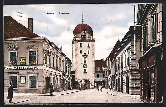 AK Leoben, Blick zum Stadtturm und Gasthaus Zum Mohren