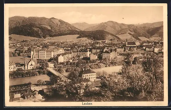 AK Leoben, Die Ortschaft am Fluss aus der Vogelschau