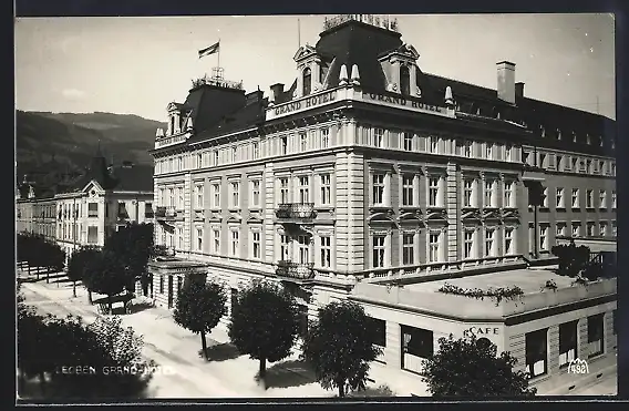 AK Leoben, Grand Hotel mit Strasse aus der Vogelschau