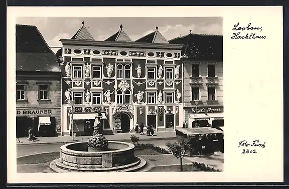 AK Leoben, Hacklhaus mit Geschäften und Brunnen