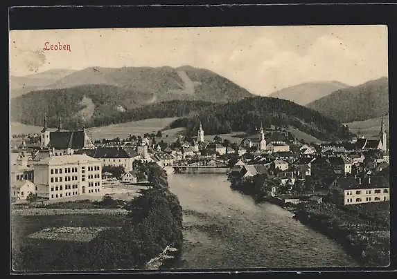 AK Leoben, Ortsansicht mit Fluss und Brücke