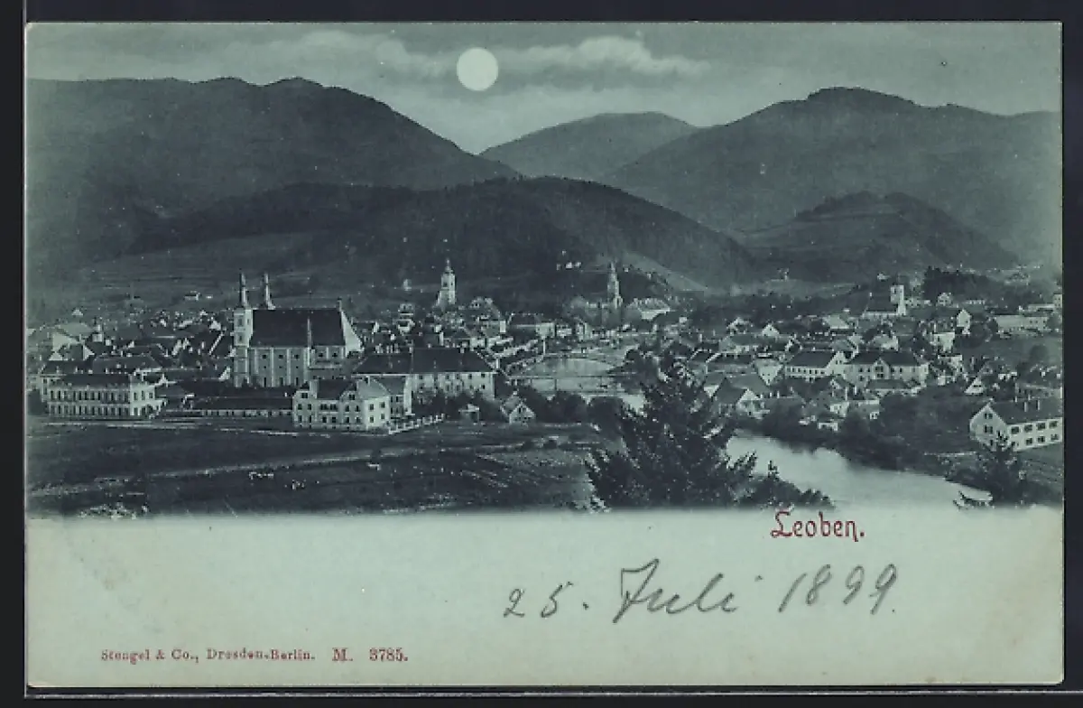 AK Leoben, Ortsansicht mit Kirche und Brücke