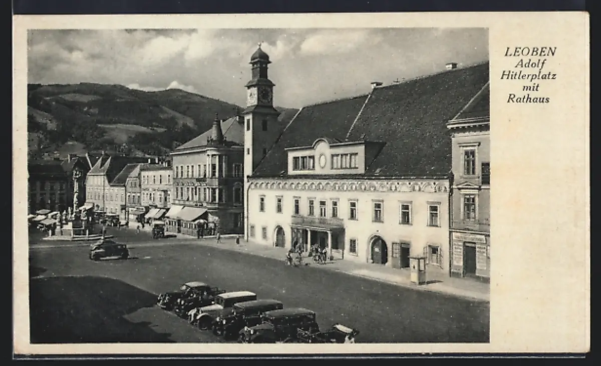AK Leoben, platz mit Rathaus aus der Vogelschau