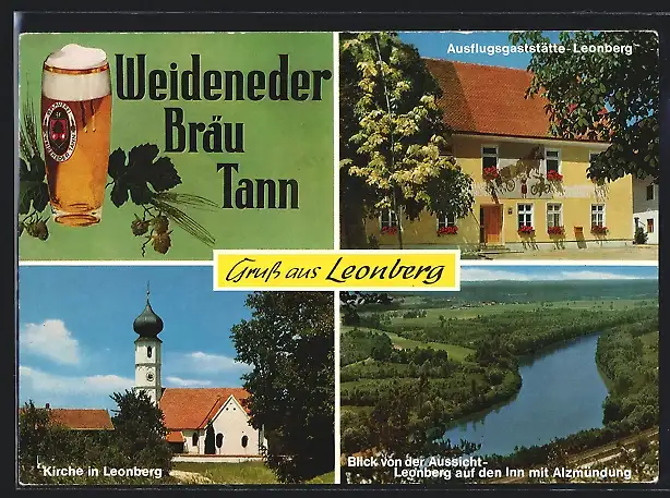 AK Leonberg / Inn, Ausflugs-Gaststätte, Weidener Bräu Tann, Kirche und Inn mit Alzmündung