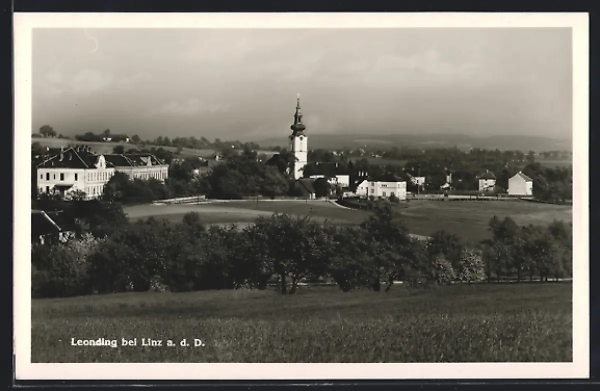 AK Leonding, Ortsansicht mit Kirche vom Feld aus