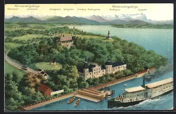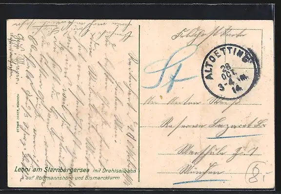 AK Leoni, Ansicht mit Drahtseilbahn auf Rottmannshöhe und Bismarckturm, gr. Dampfer