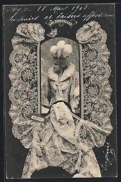 AK Les Dentelles, Point de Bruxelles, Spitzenklöppelei u. eine Frau mit Perücke u. aufgemaltem Punkt auf der Wange