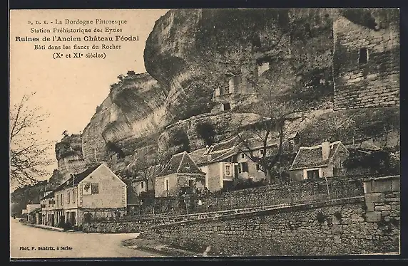 AK Les Eyzies, Ruines de l`Ancien Chateau Feodal bati dans les flancs du Rocher