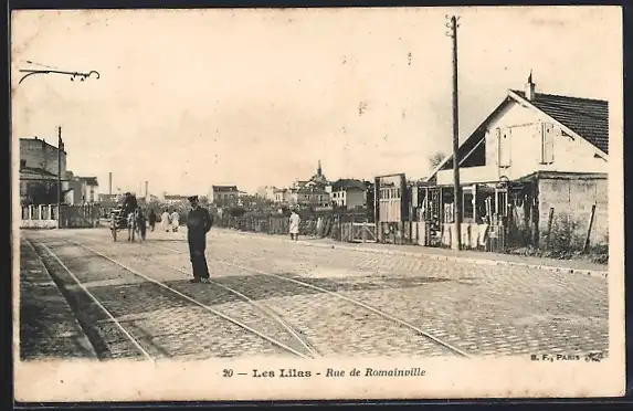 AK Les Lilas, Rue de Romainville avec passants et rails de tramway