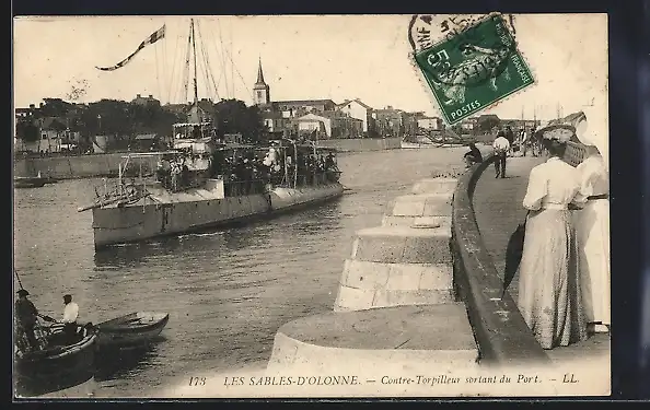 AK Les Sables-d`Olonne, Contre-torpilleur sortant du port avec promeneurs sur le quai