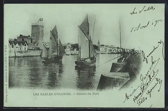 AK Les Sables-d`Olonne, Entrée du port avec voiliers et fortifications en arrière-plan