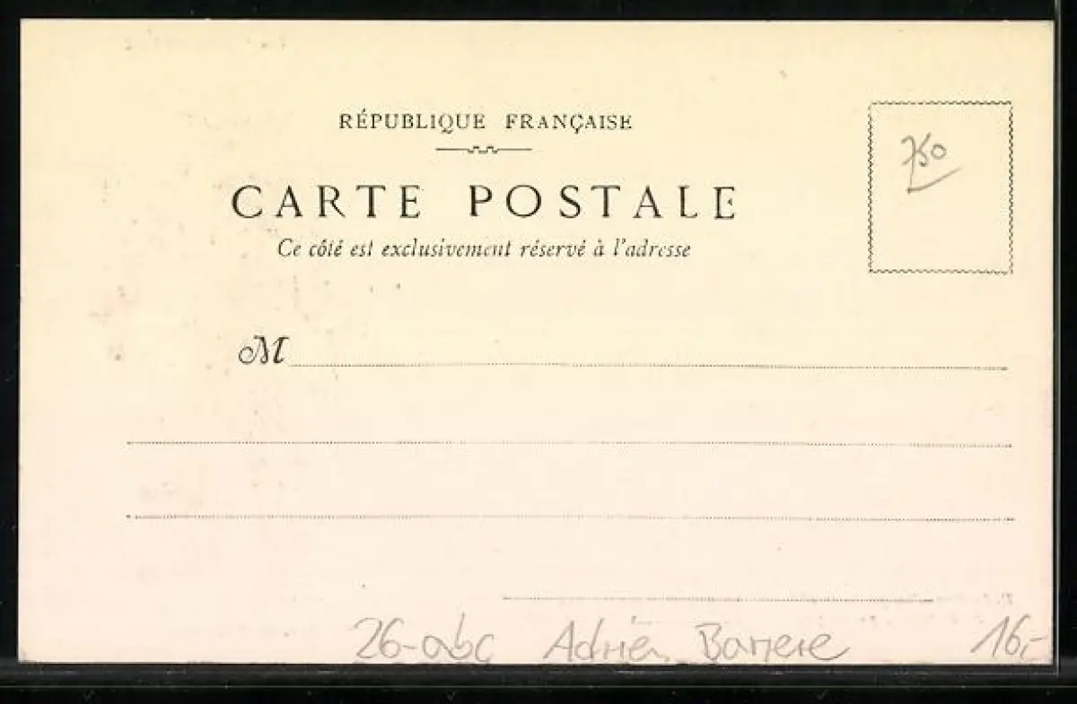 Personenbezogene Daten auf der Rückseite der Karte wurden durch blauen Textmarker unkenntlich gemacht. Die blauen Stellen sind auf die Vorderseite durchgeweicht und wirken sich negativ auf das Postkartenfoto aus