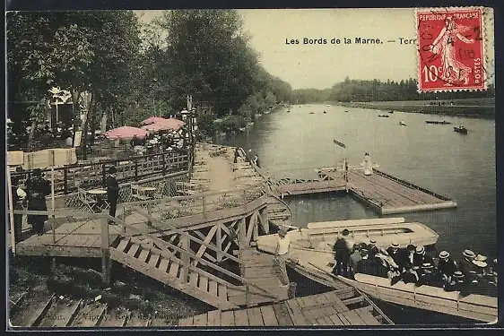 AK Les bords de la Marne, Terrasse au bord de l`eau et embarcations