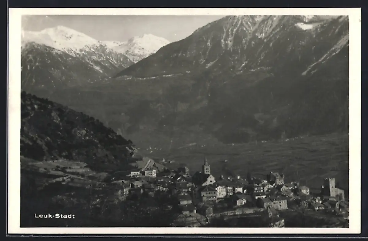 AK Leuk, Leuk-Stadt mit Bergpanorama aus der Vogelschau