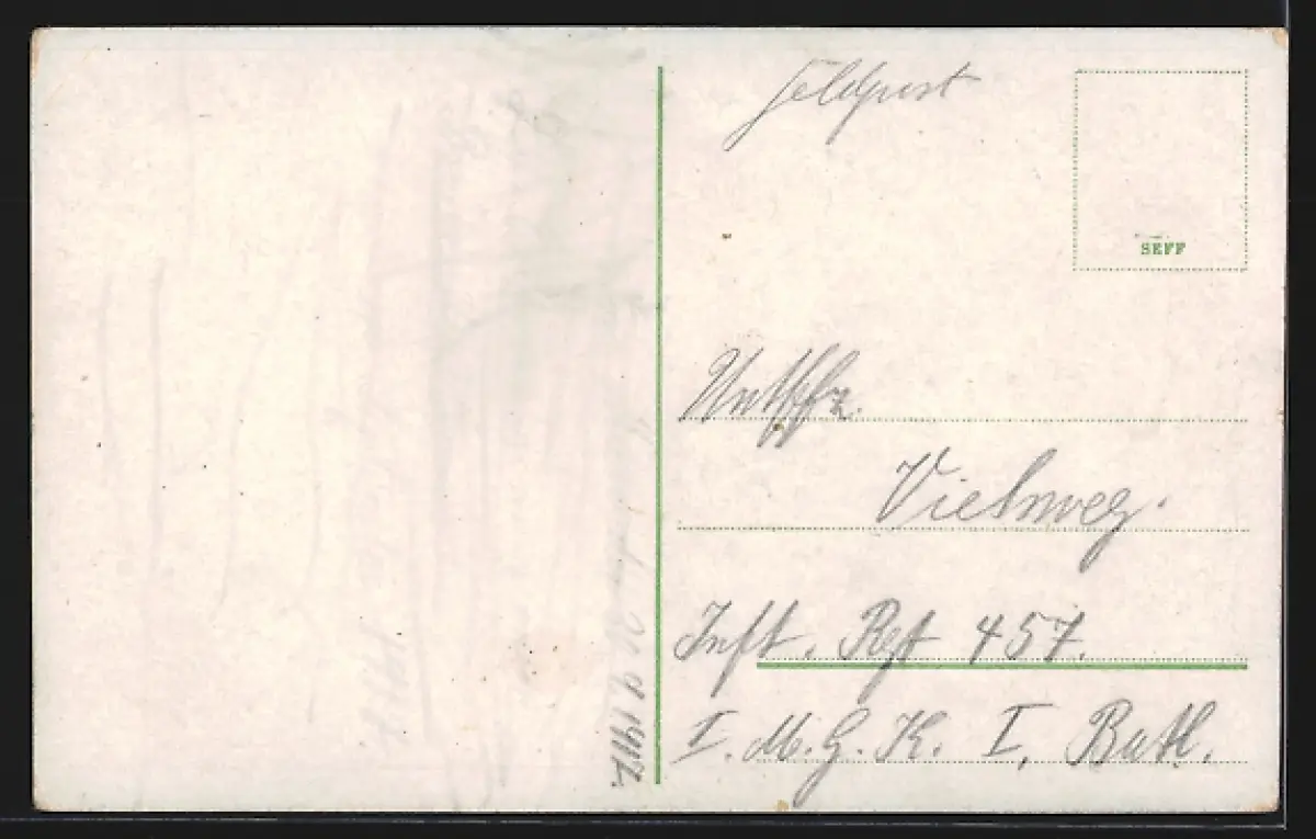 Personenbezogene Daten auf der Rückseite der Karte wurden durch blauen Textmarker unkenntlich gemacht. Die blauen Stellen sind auf die Vorderseite durchgeweicht und wirken sich negativ auf das Postkartenfoto aus