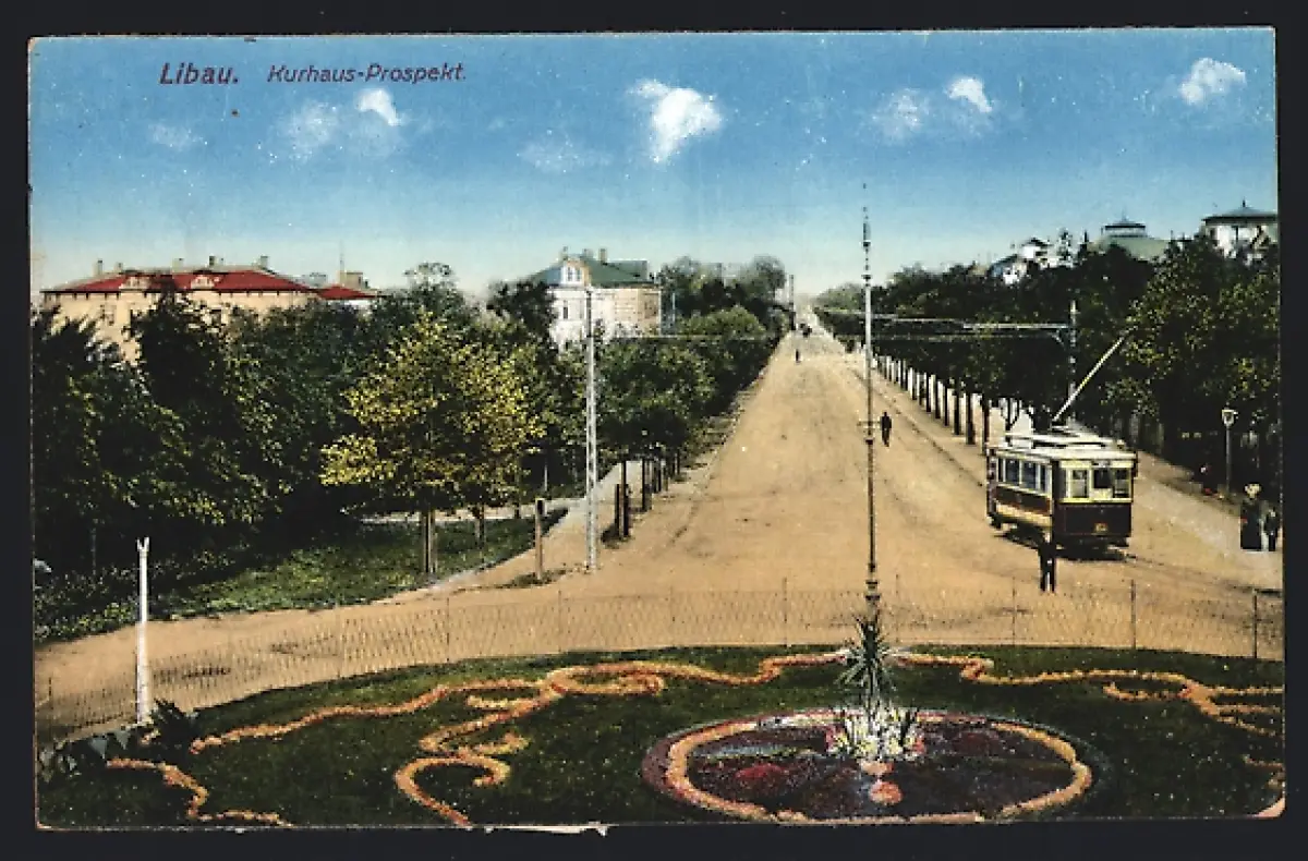 AK Libau, Kurhaus-Prospekt mit Strassenbahn
