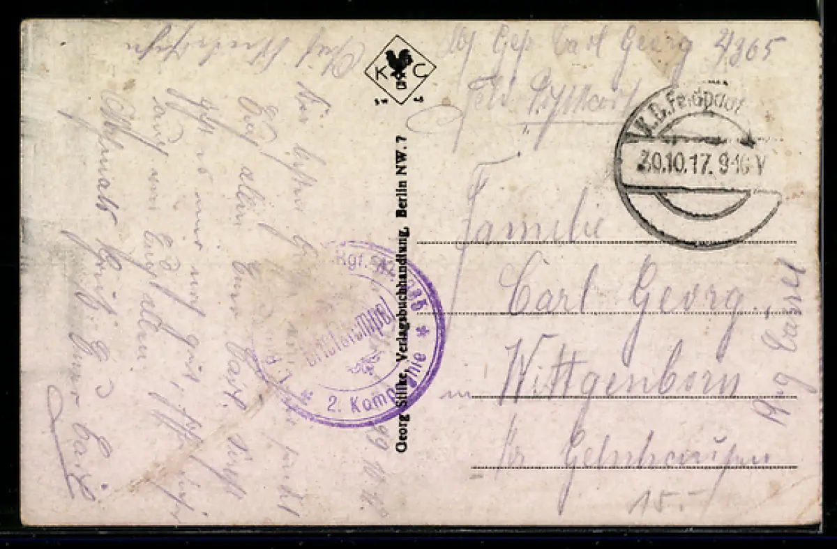 alte Ansichtskarte, gelaufen 1917, Eckknicke unten, Bugspur li. mittig, guter Zustand