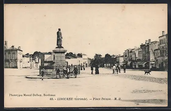 AK Libourne, Monument auf der Place Decazes mit umliegenden Gebäuden und Passanten