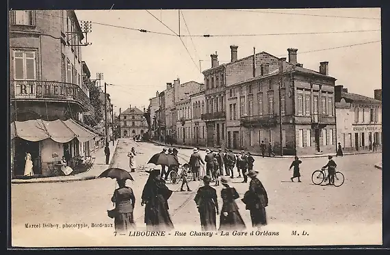 AK Libourne, Rue Chanzy, La Gare d`Orléans avec passants et cycliste