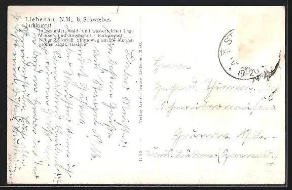 Personenbezogene Daten auf der Rückseite der Karte wurden durch blauen Textmarker unkenntlich gemacht. Die blauen Stellen sind auf die Vorderseite durchgeweicht und wirken sich negativ auf das Postkartenfoto aus