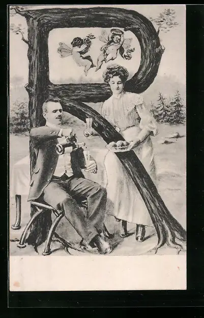 AK Liebespaar beim Weingenuss im Buchstaben R, umschwirrt von Elfen