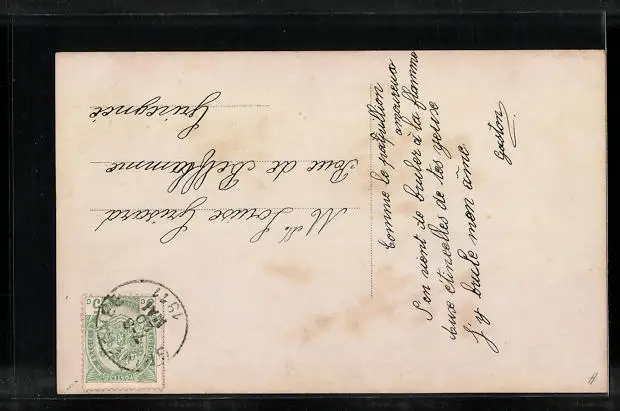 Personenbezogene Daten auf der Rückseite der Karte wurden durch blauen Textmarker unkenntlich gemacht. Die blauen Stellen sind auf die Vorderseite durchgeweicht und wirken sich negativ auf das Postkartenfoto aus