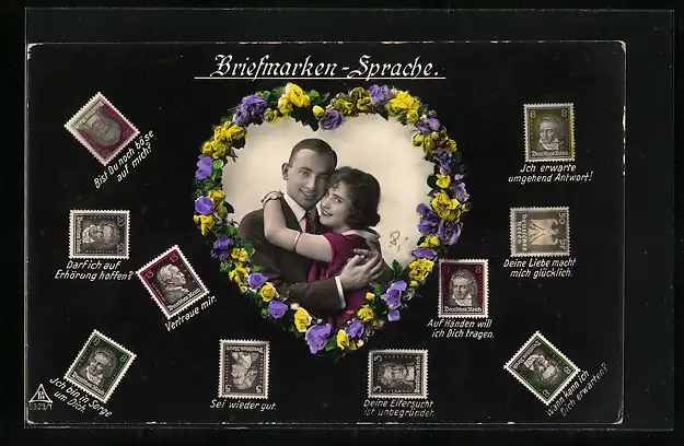 AK Liebespaar in herzförmigem Blumenkranz, Briefmarkensprache