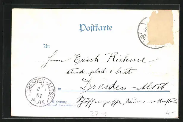 alte Ansichtskarte, gelaufen 1901, Briefmarke entfernt, rückseitig Oberflächenschaden, guter Zustand