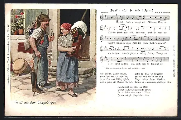 AK Lied Nr. 418, Dort'n uhm sei mir drham, Text, Mann mit Pfeife, Frau mit Klöppelmaschine