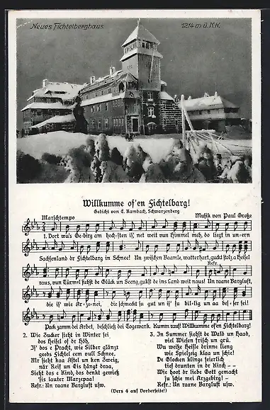 AK Lied: Willkumme of`en Fichtelbarg!, Neues Fichtelberghaus im Winter