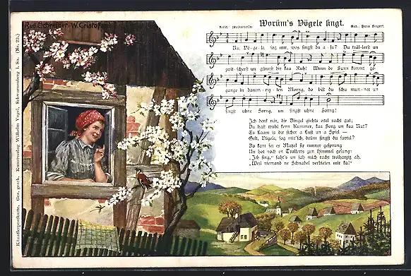 AK Lied Worüms Vögele singt, Haus und Ortsschaft im Frühling