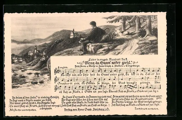 AK Lied in erzgebirgischer Mundart Wenn da Sunn unter gieht-Wanderer blickt auf den Ort