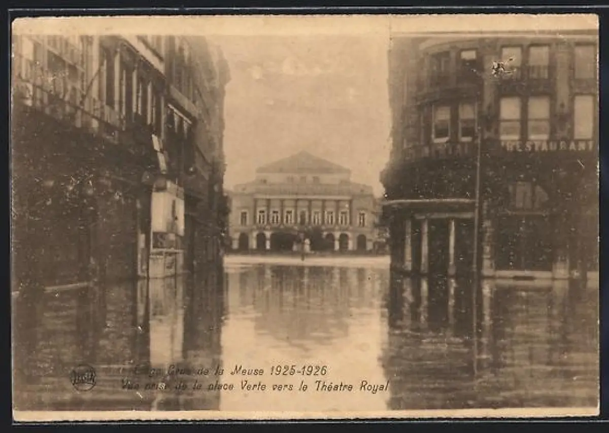 AK Liege, Crue de la Meuse 1925-1926, Vue prise de la place Verte vers le Theatre Royal