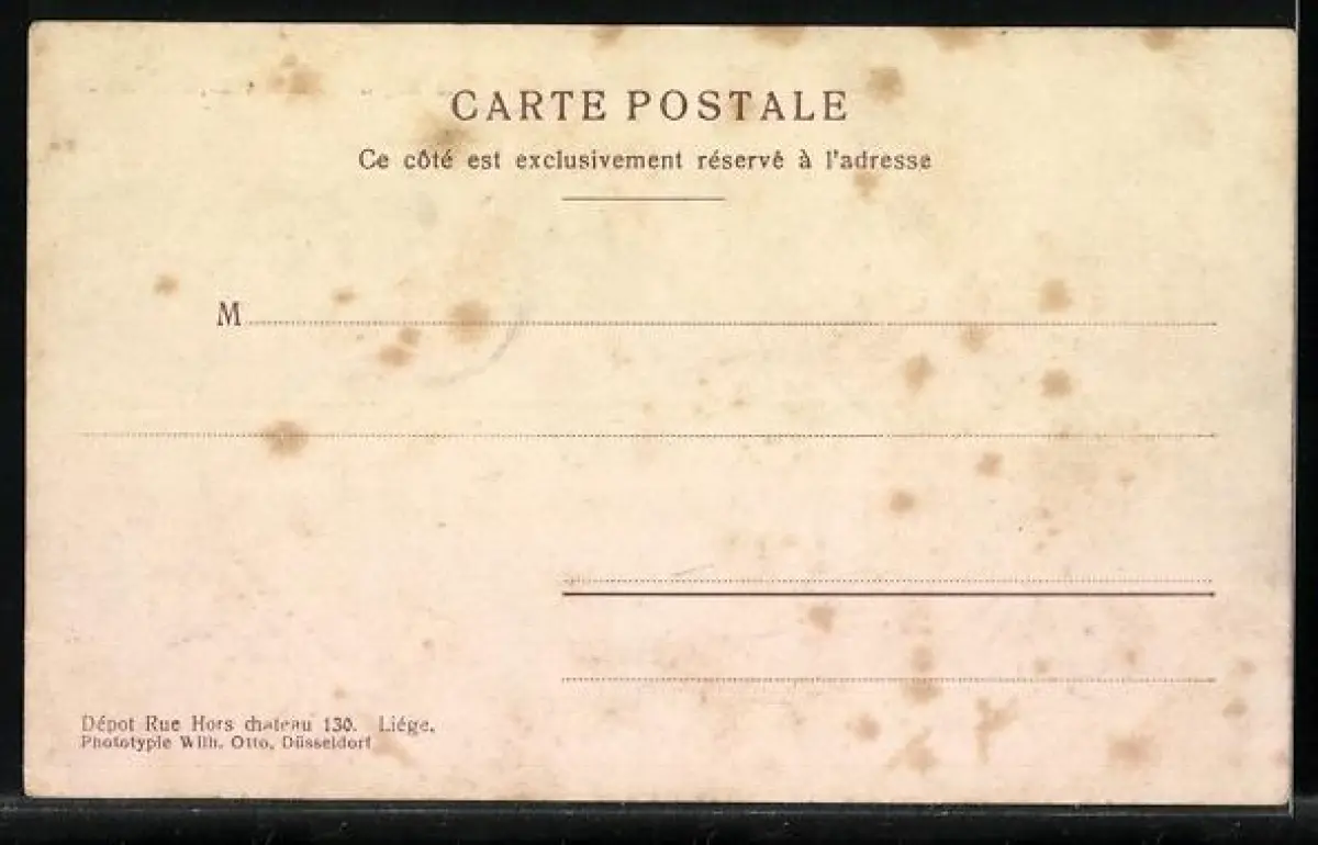 Personenbezogene Daten auf der Rückseite der Karte wurden durch blauen Textmarker unkenntlich gemacht. Die blauen Stellen sind auf die Vorderseite durchgeweicht und wirken sich negativ auf das Postkartenfoto aus