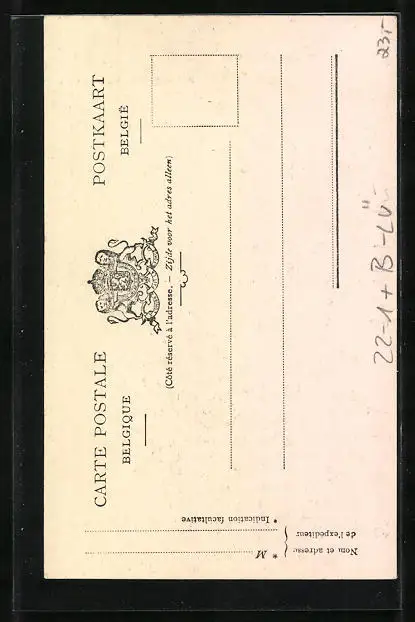 Personenbezogene Daten auf der Rückseite der Karte wurden durch blauen Textmarker unkenntlich gemacht. Die blauen Stellen sind auf die Vorderseite durchgeweicht und wirken sich negativ auf das Postkartenfoto aus