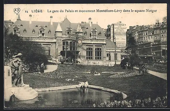 AK Liége, La gare du Palais et monument Montéfiore-Lévy dans le square Notger
