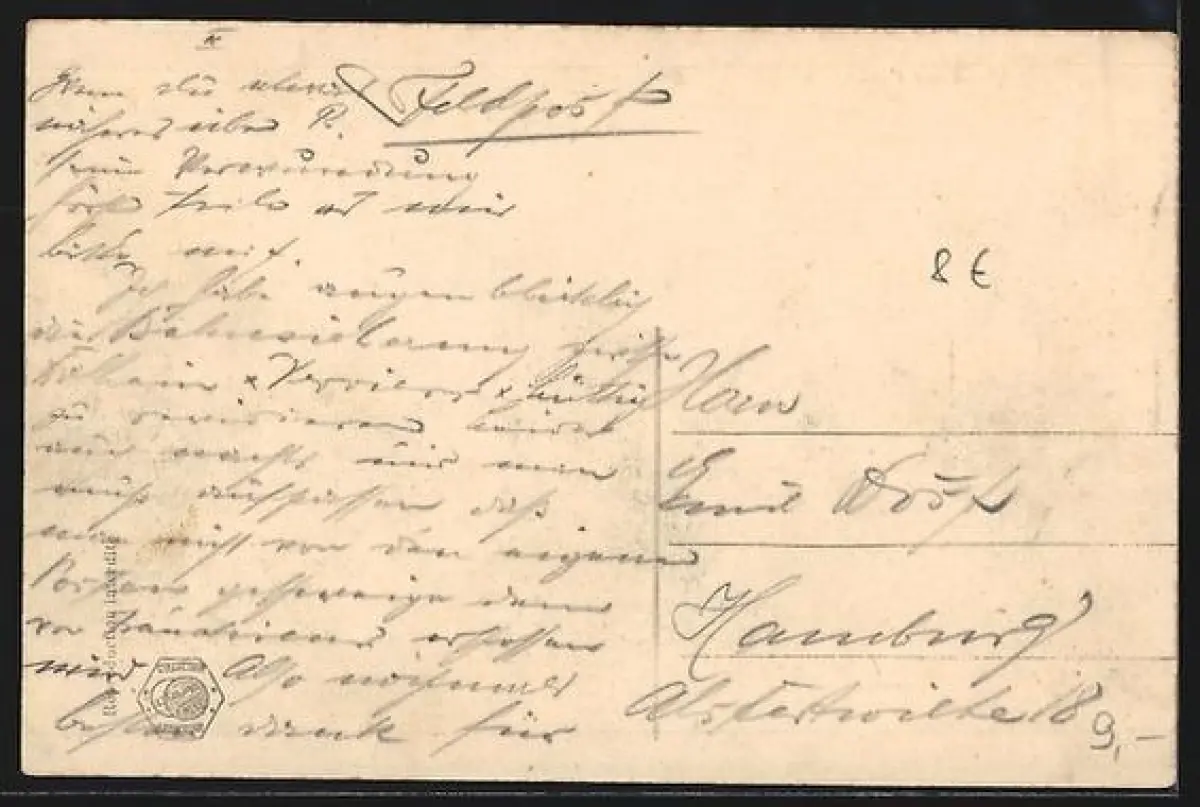 Personenbezogene Daten auf der Rückseite der Karte wurden durch blauen Textmarker unkenntlich gemacht. Die blauen Stellen sind auf die Vorderseite durchgeweicht und wirken sich negativ auf das Postkartenfoto aus