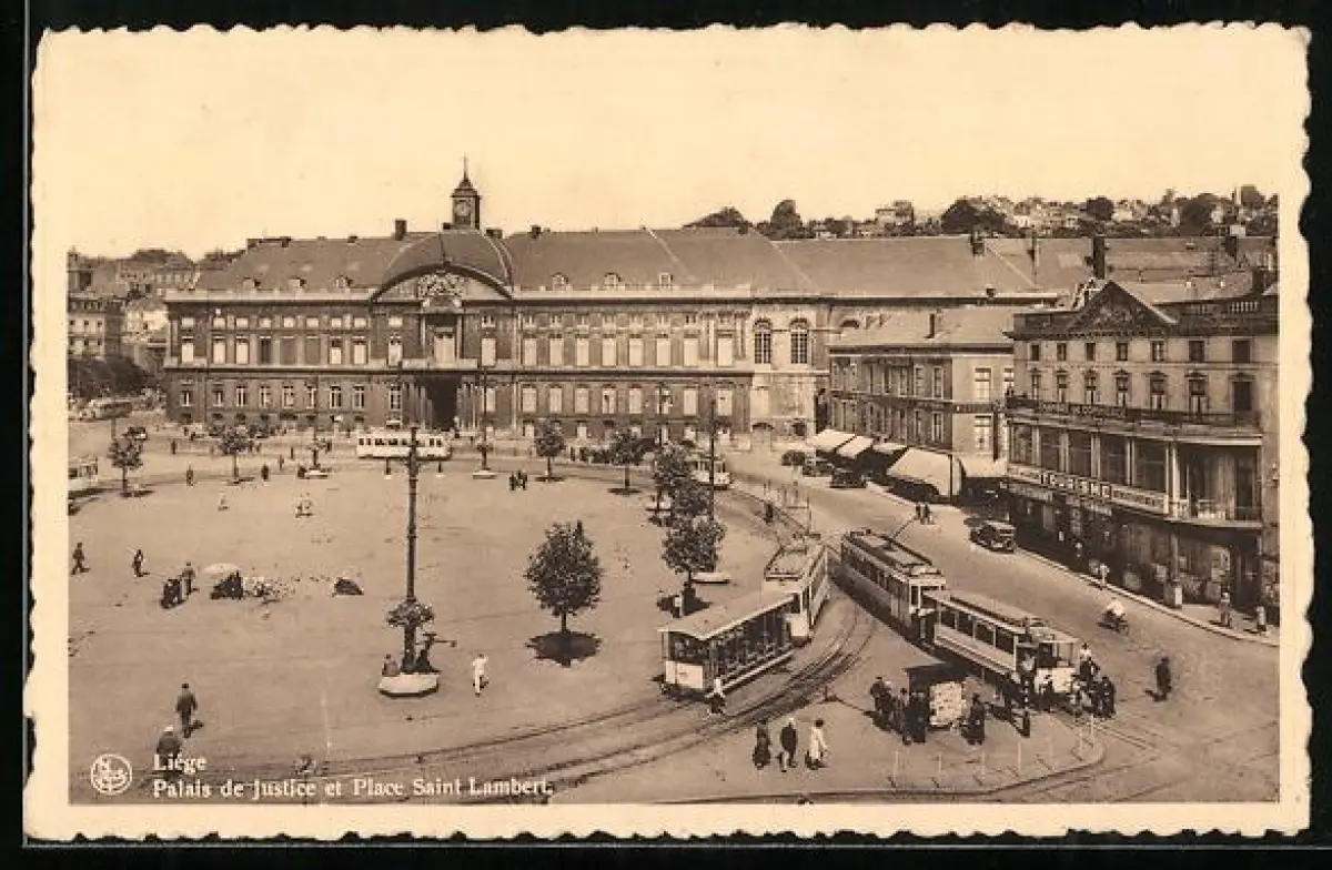 AK Liege, Strassenbahn auf dem Place Saint Lambert mit Palais de Justice