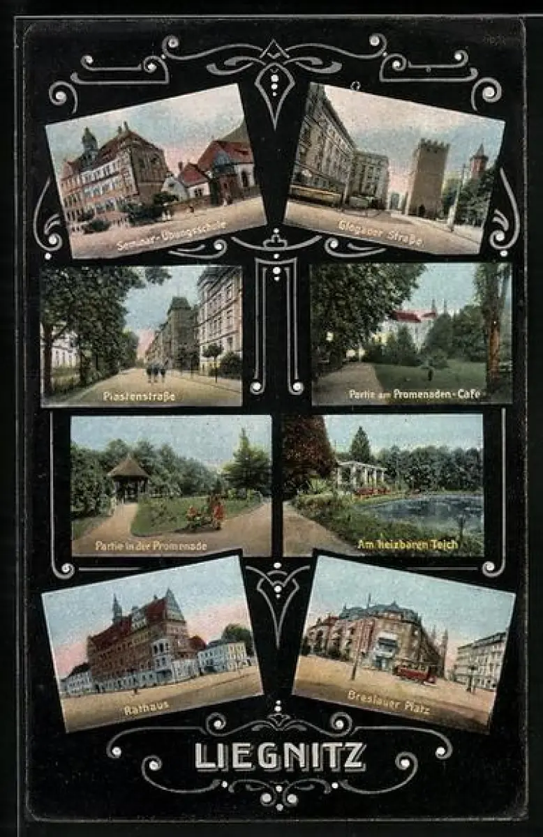 AK Liegnitz, Breslauer Platz mit Strassenbahn, Glogauer Strasse, Piastenstrasse und Seminar-Übungsschule