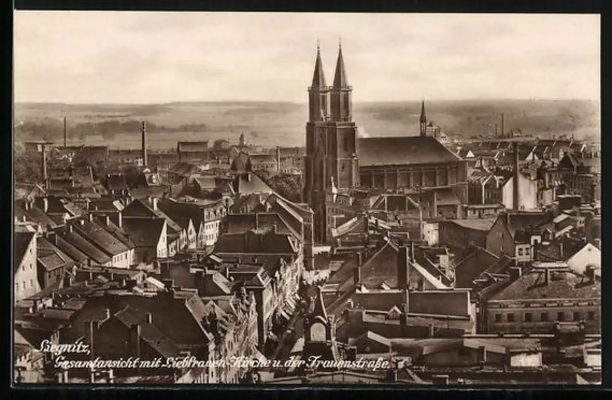 AK Liegnitz, Gesamtansicht mit Liebfrauen-Kirche und der Frauenstrasse