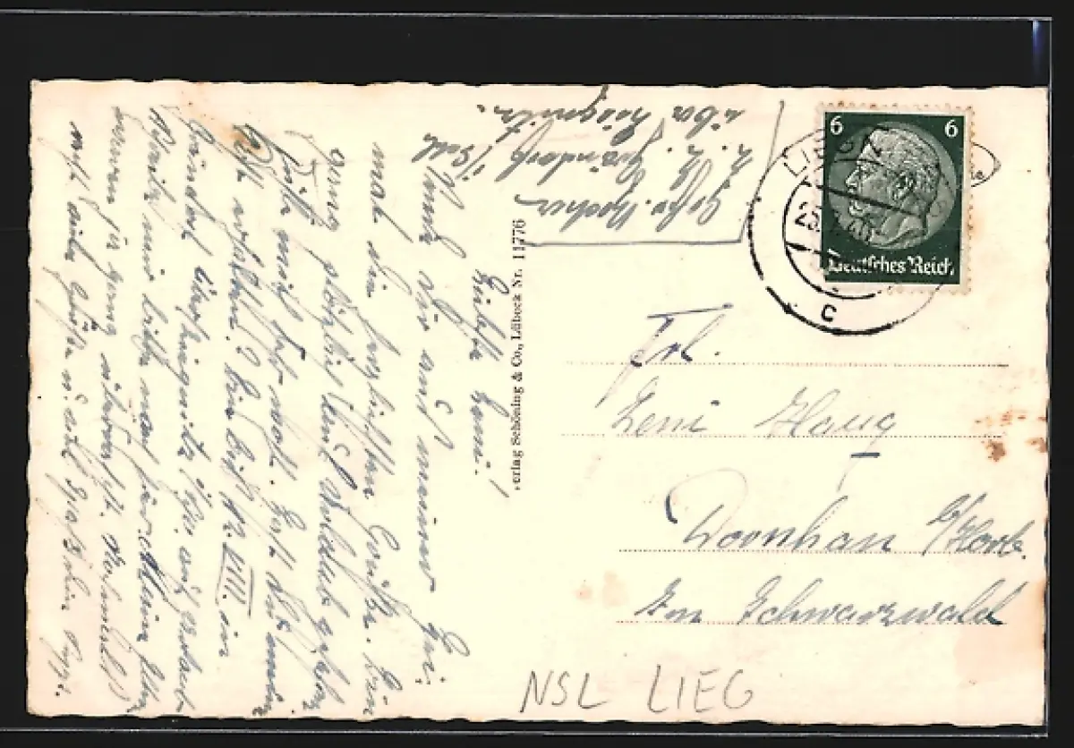 Personenbezogene Daten auf der Rückseite der Karte wurden durch blauen Textmarker unkenntlich gemacht. Die blauen Stellen sind auf die Vorderseite durchgeweicht und wirken sich negativ auf das Postkartenfoto aus