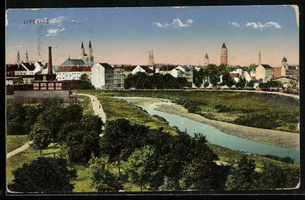 AK Liegnitz, Stadtpanorama vom Fluss aus