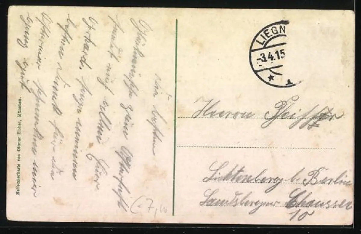 alte Ansichtskarte, gelaufen 1915, Briefmarke entfernt, Stempelspur, rückseitig Oberflächenschaden, Bugspuren links oben