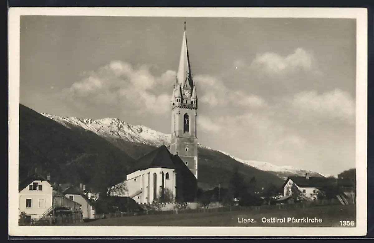 AK Lienz /Osttirol, Pfarrkirche mit verschneiten Gipfeln