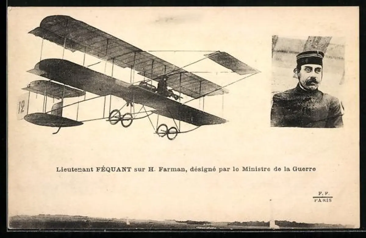 AK Lieutenant Féquant im Doppeldecker-Flugzeug von H. Farman