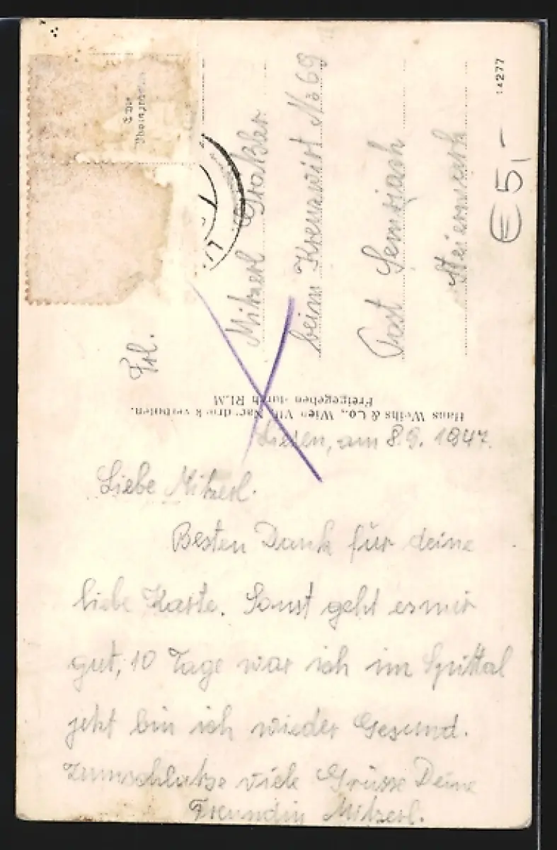 alte Ansichtskarte, gelaufen 1947, Briefmarke entfernt, guter Zustand